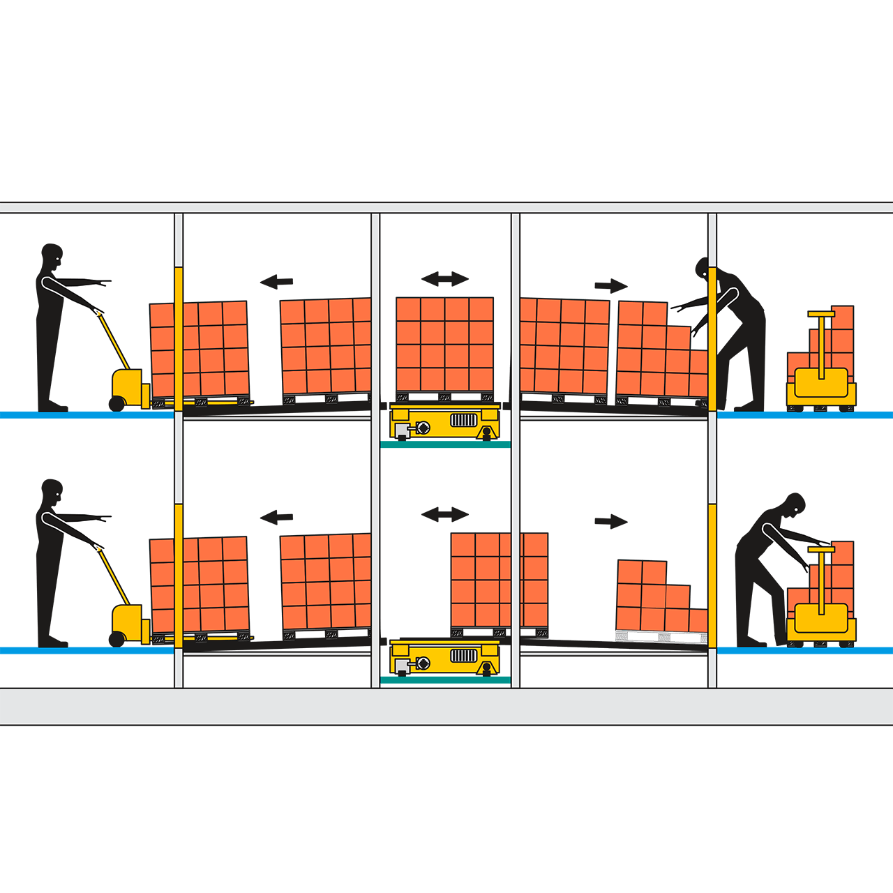 Automatizované paletové regály nevyžadují velké servisní uličky pro zaměstnance a vysokozdvižné vozíky. Místo toho se zakladače pohybují v úzkých uličkách a kyvadlové nosiče se dostanou do uliček jednotlivých úrovní regálů, ukládají palety s maximální přesností a minimálními rozestupy. Výškové regály navíc využívají celou výšku skladu. Automatizované systémy mohou palety dynamicky ukládat a odebírat, tj. skladovací pozice mohou být přiděleny podle poptávky. Palety s nejčastěji používanými položkami mohou být uloženy na snadněji přístupných místech, zatímco méně často používané položky jsou uloženy v zadních částech skladu. To znamená, že dostupný prostor bude využit efektivněji. Na základě specifických parametrů, jako je typ uloženého produktu, frekvence obratu a datum expirace, může být přiřazení skladovacích pozic optimalizováno systémem správy zásob nebo skladu.
