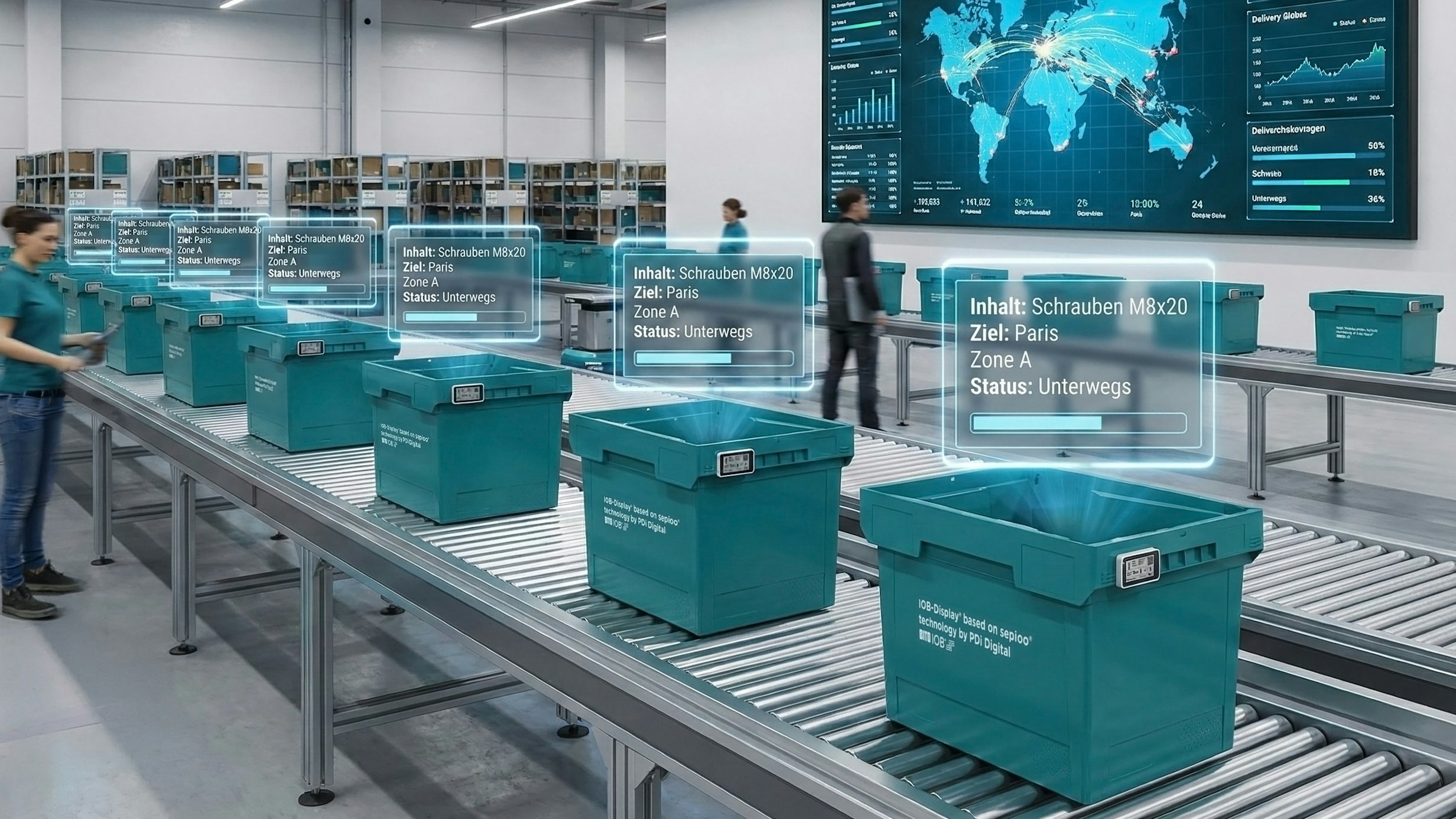 Beim Durchlauf durch verschiedene Standorte erfassen Sensoren und Gates die Behälter automatisch. Die Plattform erkennt den jeweiligen Standort und triggert entsprechende Informationsupdates auf den Smart Labels. So zeigt derselbe Behälter beim Produzenten Produktionsdaten, im Verteilzentrum Kommissionierinformationen und in der Filiale Verkaufsdaten. Alle Bewegungen werden lückenlos dokumentiert und sind in Echtzeit nachvollziehbar.