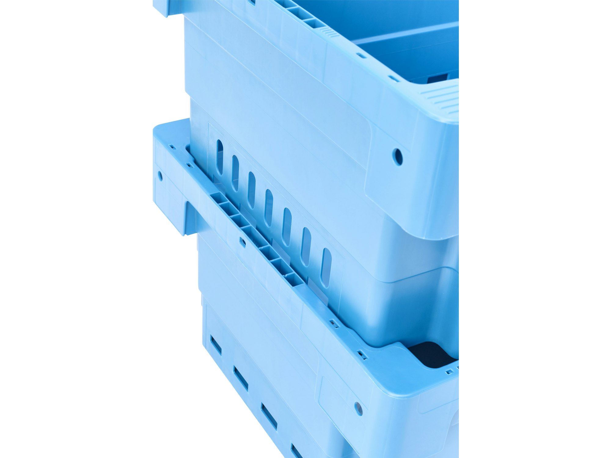 Leicht und dabei extrem stabil ist die Drehstapelbehälter-Variante mit Rippenboden. Sie eignet sich für Lagerung und Transport schwerer Lasten.
