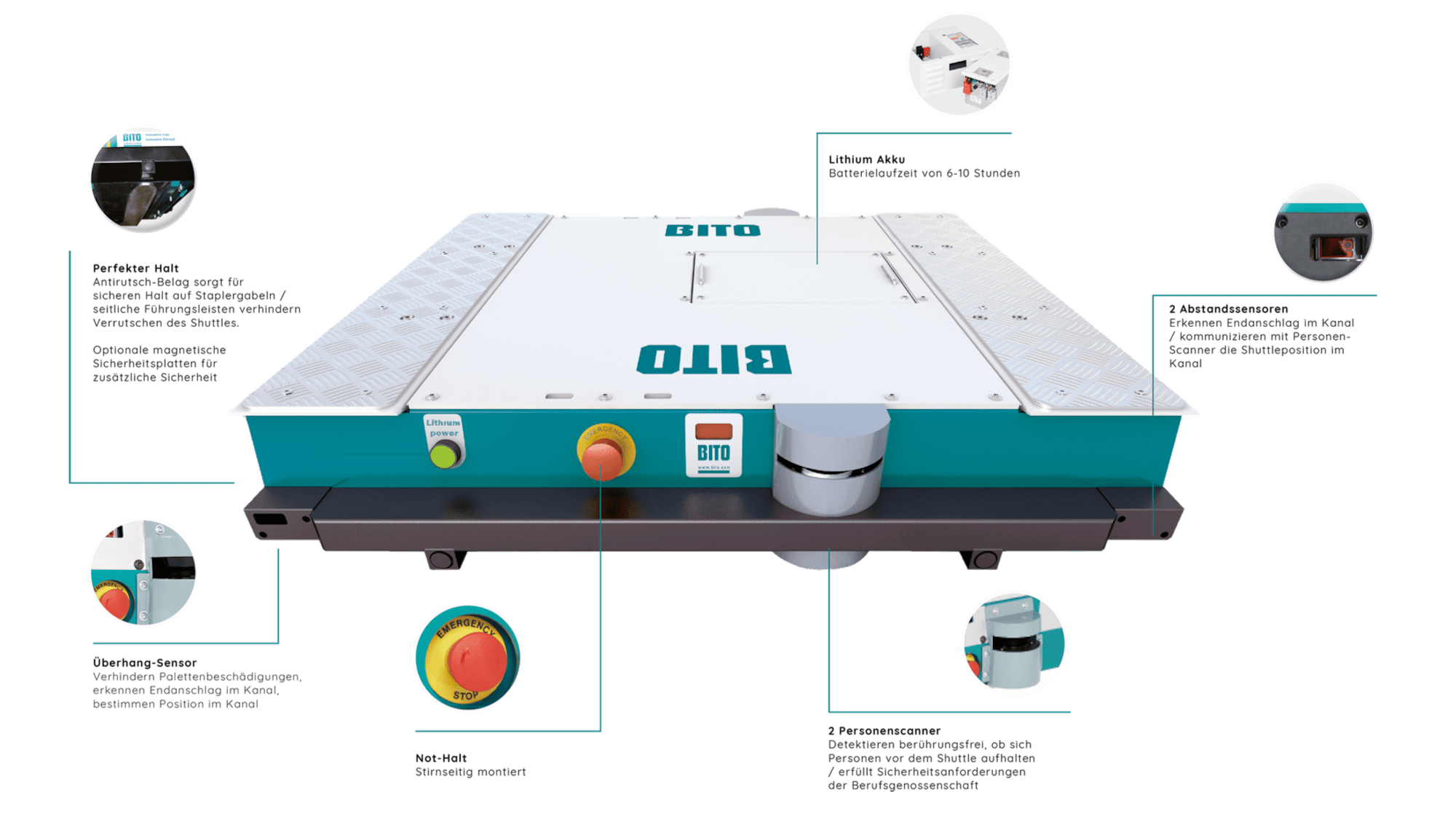 Das Paletten-Shuttle-Lager verbindet kompakte Lagerung mit der Flexibilität, die das Shuttle ermöglicht. Der Gabelstapler setzt das akkubetriebene Paletten-Shuttle in den Kanal ein, wo es dann via Fernbedienung seine Transportaufgabe durchführt. Es bringt die palettierte Ware zum Stapler oder übernimmt sie vom Stapler und bringt sie zum Lagerplatz. Es wird kein Hilfsgefälle wie bei Palettendurchlaufregalen benötigt, was eine maximale Lagerdichte ermöglicht. Die Lagerebenen können unabhängig voneinander bestückt werden und zudem ist die Lagerung halbautomatisch nach dem LIFO- und FIFO-Prinzip möglich. Mit dem Paletten-Shuttle sind relativ hohe Umschlagleistungen realisierbar. Durch den Einsatz von weiteren Shuttles kann sie auch leicht gesteigert werden.