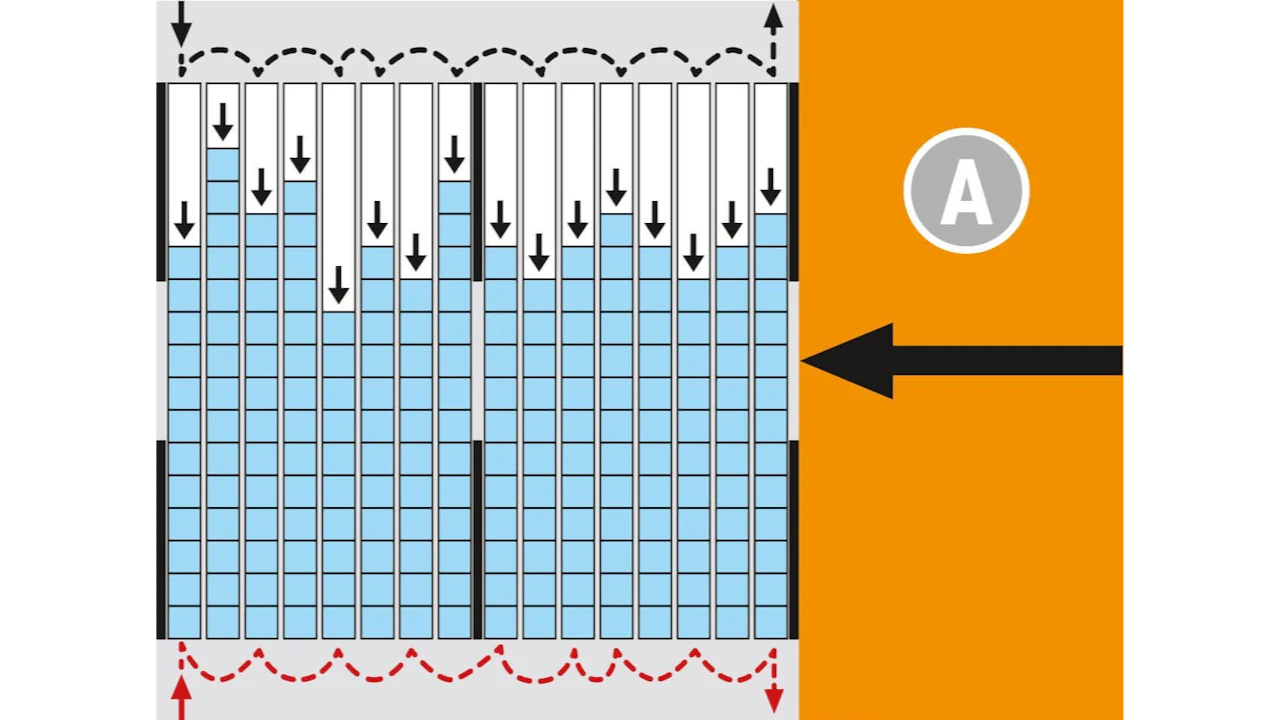 Conforme al principio FIFO (First in – First out), la primera mercancía almacenada es la primera en ser retirada. Los diferentes canales de cada bloque de estanterías se van llenando con palets por el lado de aprovisionamiento. La retirada se efectúa por el lado opuesto. El retenedor dispuesto en el lado de recogida garantiza que la carretilla elevadora pueda recoger el palet sin presión dinámica. Se evitan así daños a la mercancía.