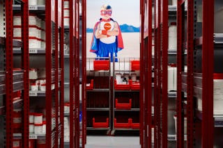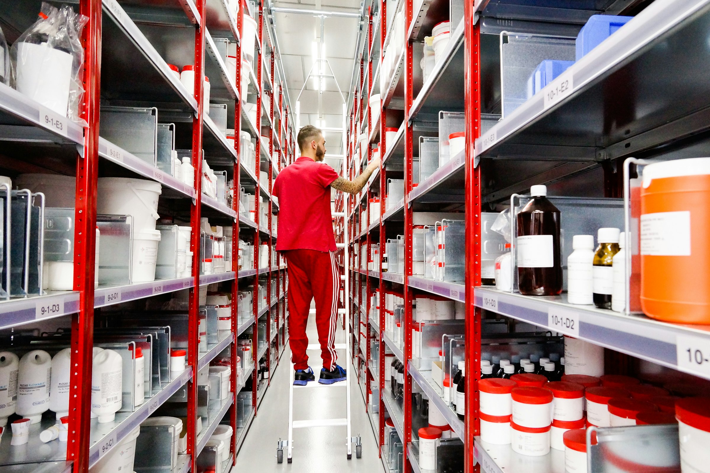 - » En el área de Materias Primas, BITO ha instalado una solución de estanterías de paletas a medida, como recintos para productos psicotrópicos, estanterías para botellas, bandejas de recogida para productos corrosivos, insertos de acero para el picking, etc.