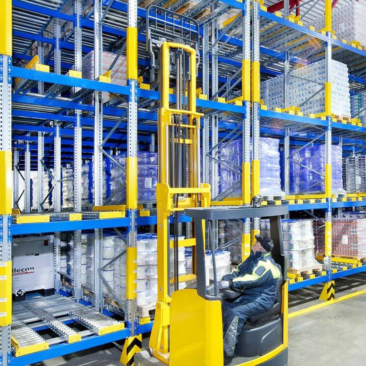 Juomakuormalavoja pinotaan usein lattialle. Kuitenkin kuormalavahyllyt ovat parempi ratkaisu. Ne lisäävät merkittävästi kuormalavapaikkojen määrää ja läpimenoaikaa, ja ne erottavat sisään tulevat tavarat ulos menevistä tavaroista. Näin se toimii: Juomakoreja, jotka on varastoitu Euro-kuormalavoille, toimitetaan rahtiautoilla tavaroiden vastaanotto-osastolle. Kuormalavat puretaan trukilla ja syötetään lyhyeltä sivultaan läpivirtaushyllyn kuormaussivulle. Kuormausradat on asennettu lievään alamäkeen tavaroiden vastaanottosivulta keräilyalueelle. Painovoiman vaikutuksesta kuormalavat liikkuvat alamäkeen kiinteällä kaltevuudella asennettua rullarataa pitkin. Tämä varastointimenetelmä mahdollistaa tiiviin varastoinnin ja tarjoaa riittävän puskurivaraston kysynnän vaihteluiden tasaamiseksi. Jarrurullat varmistavat, että kuormalavat eivät kiihdy. Yleisesti ottaen kuormalavavirtajärjestelmät, joita kutsutaan myös painovoimahyllyiksi tai painovoimasyötetyiksi hyllyiksi (GFR), soveltuvat nopeasti kiertäville irtotavaroille, kuten kivennäisvesille. Sisään- ja ulostulevien tavaroiden erottaminen tarkoittaa, että toimintaan ei tule häiriöitä. Trukit eivät ole toistensa tiellä, eivätkä sisään- ja ulostulevat tilaukset sekoitu.