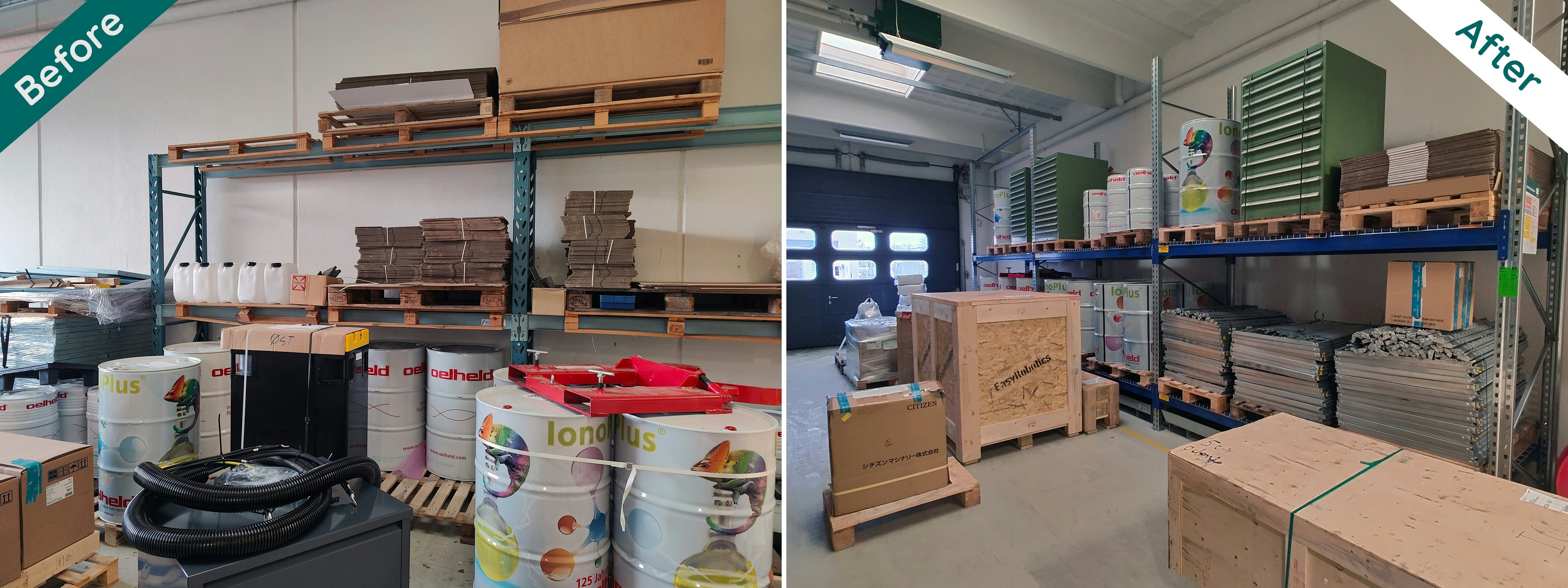Vanhan hyllystön tilalle asennettiin kuormalavahyllystö, jossa on tilaa öljyn säilytykselle lattiatasossa olevassa öljysäiliössä.