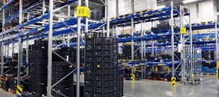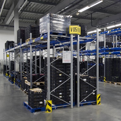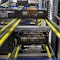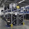 - Pour les machines à haut rendement, nous avons prévu des rayonnages dynamiques pour palettes au niveau du sol, certains avec un stock supplémentaire dans un couloir dynamique sus-jacent.