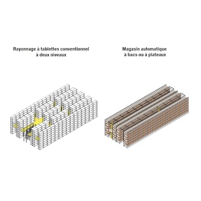 » Toutefois, dans le magasin automatique à bacs et plateaux, les conteneurs sont disposés sur une double profondeur, contrairement aux rayonnages à tablettes.