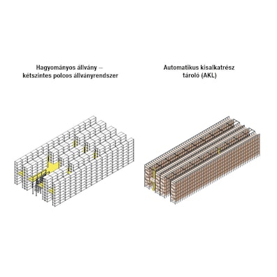» Ugyanannyi tárolóládahely mellett az automatizált kisalkatrész-raktár helyigénye jóval kisebb, mint egy kétszintes polcos állványrendszeré.