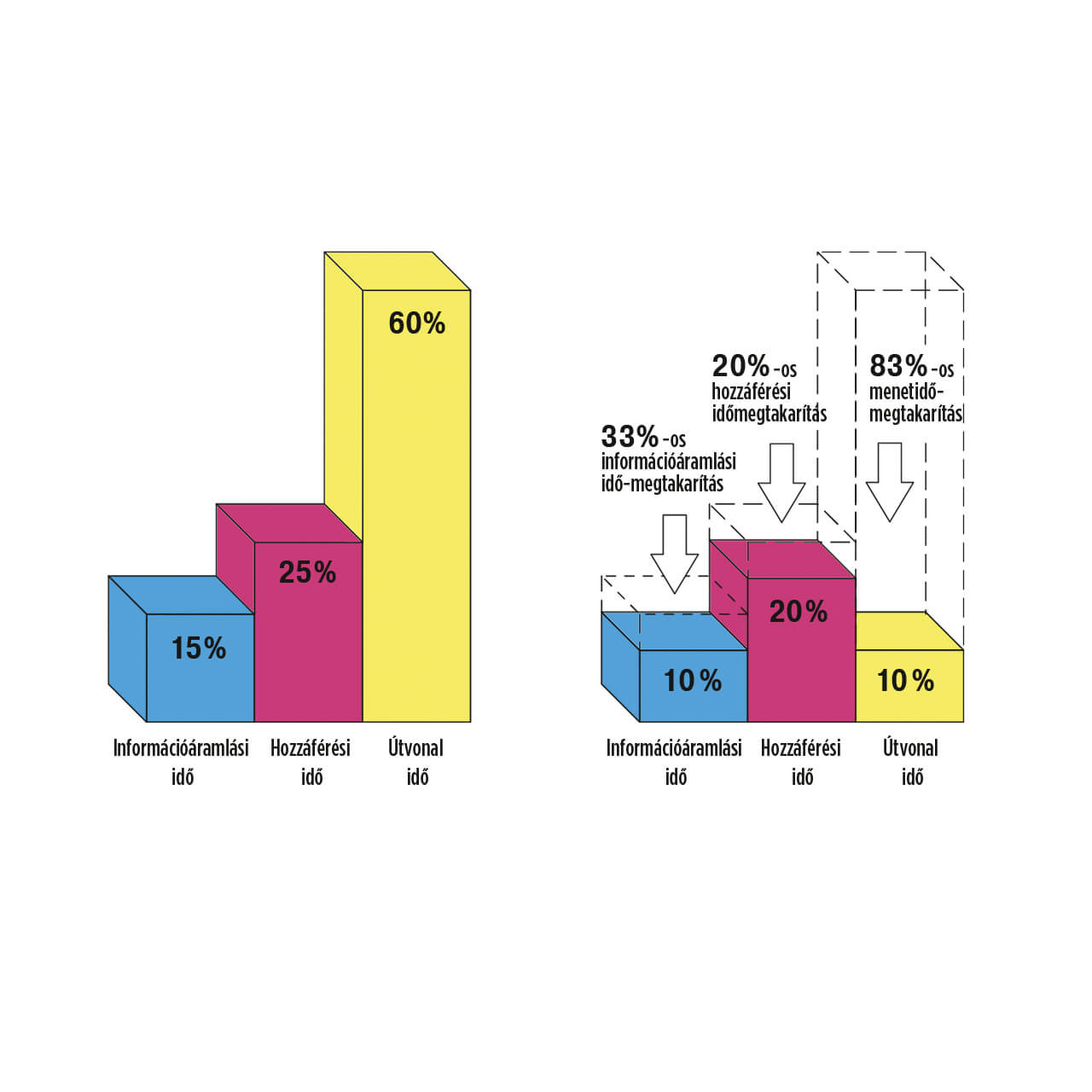 » Az árut anyagmozgató berendezéseken keresztül tárolóládákban szállítják a komissiózási helyekre. Így nem kell időt fordítani a gyaloglásra, emelésre, lerakásra, és a megfogási idők rendkívül lerövidülnek.