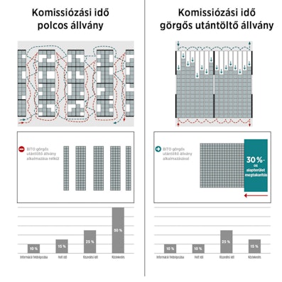 - Önnek nagy komissiózási teljesítményt kell elérnie. A darabáru-utántöltős állványokkal a kigyűjtési gyakoriság az ötszörösére növelhető a polcos állványoknál megvalósítható kigyűjtési gyakorisághoz képest.