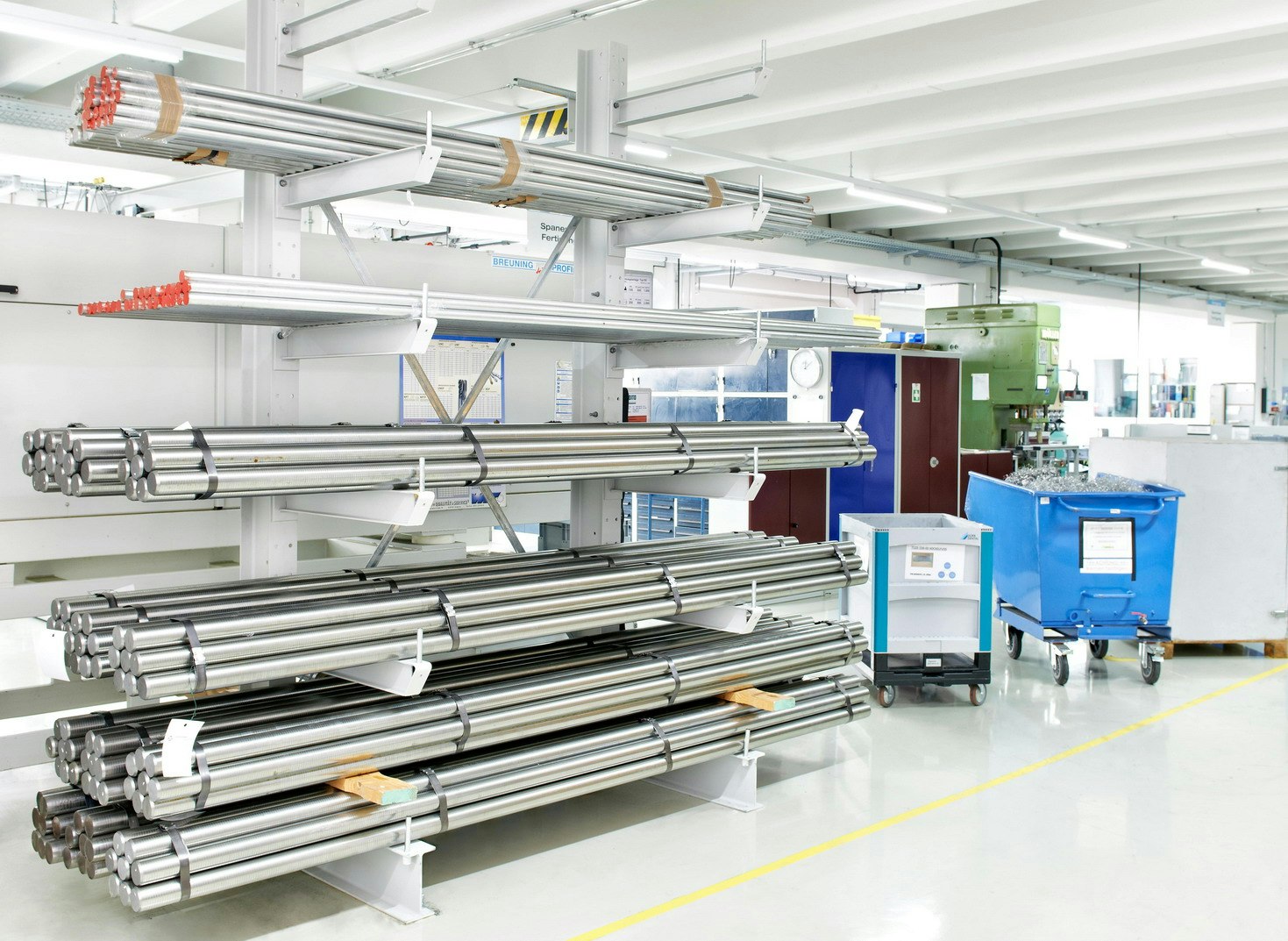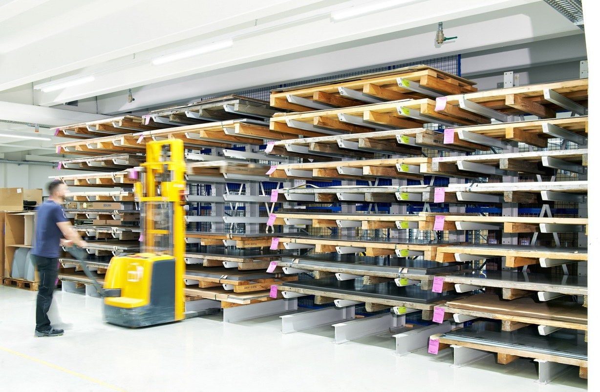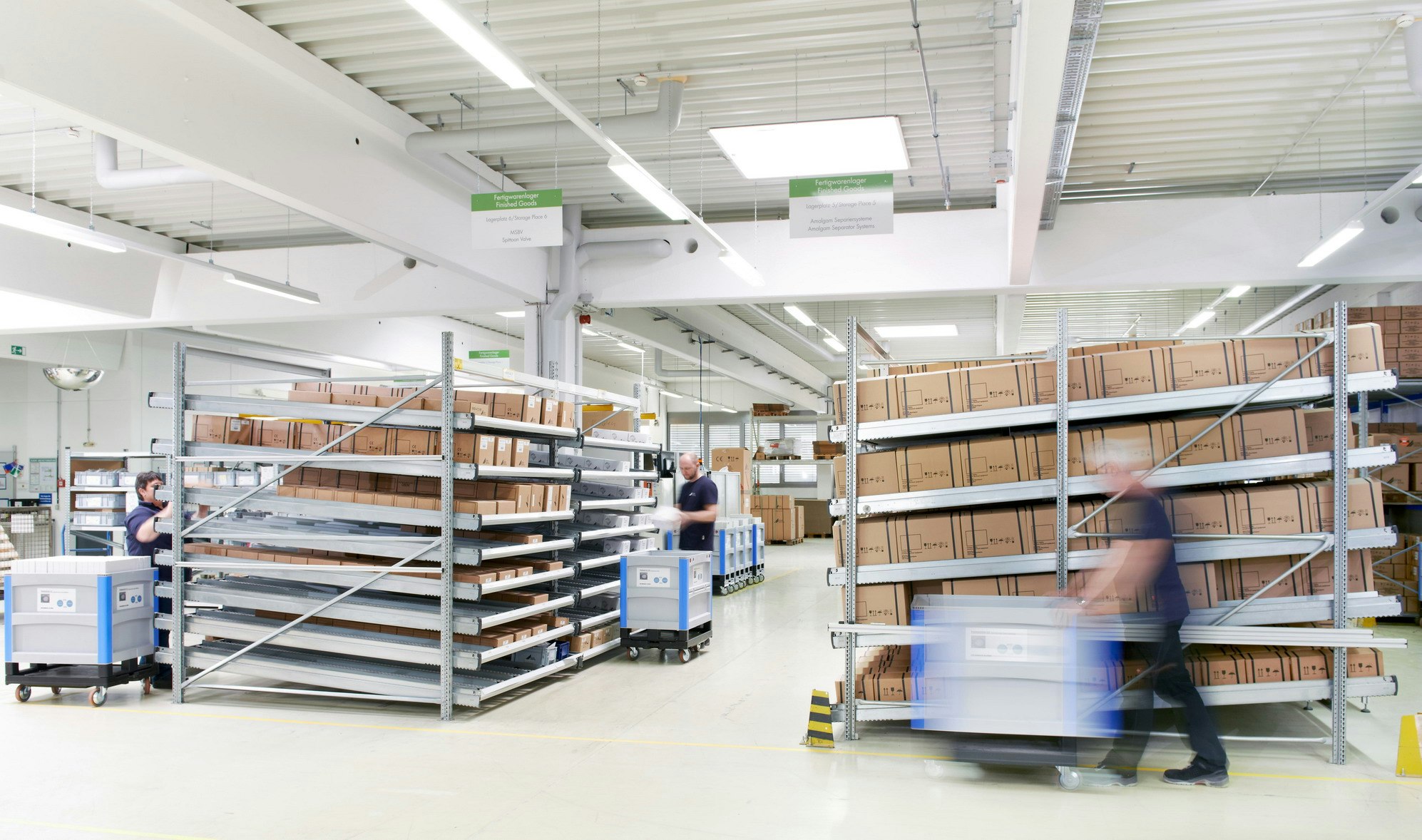 „A fejlesztési és a szerelési részleg is házon belüli” – mondja Strobel. „Az egyes alkatrészeket szinte kizárólag külső partnerekkel gyártatjuk.” Házon belül kizárólag lemezeket, valamint mart és esztergált alkatrészeket munkálnak meg. Amikor a nagyon különböző súlyú és méretű, beszállítók által gyártott alkatrészek megérkeznek az áruátvételi részlegre, ellenőrzik és szétválogatják azokat. „A gyorsan forgó és a közepes forgási sebességű árucikkek mintegy 80 százalékát az új logisztikai központban raktározzuk, a többi közvetlenül a szerelési részlegen dolgozó kollégákhoz megy” – fejti ki a termelési és logisztikai vezető. A lassan forgó árucikkek egy régebbi csarnokba kerülnek, mely az új épülettel szemben, az utca túloldalán található.