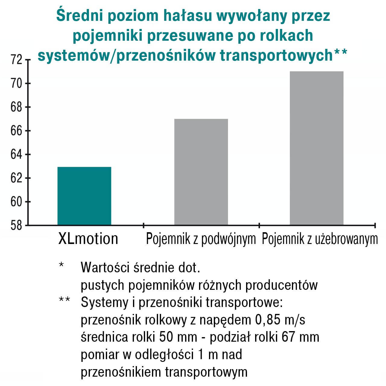 Pojemniki są łatwe w transporcie bliskim, bardzo wytrzymałe i mają ergonomiczną konstrukcję. Dzięki wyjątkowo cichemu transportowi bliskiemu pojemniki XLmotion pomagają w obniżeniu poziomu hałasu w magazynach zautomatyzowanych.