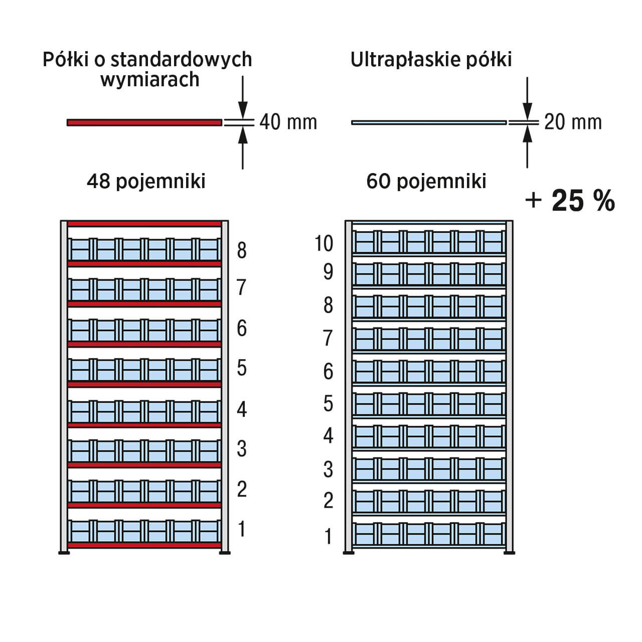 Portfolio produktów BITO obejmuje również serię regałów półkowych z pojemnikami otwieranymi od przodu, pojemnikami do produktów typu C lub pojemnikami Euro do sztaplowania. Wymiary pojemników dostosowano tak, aby zmaksymalizować wykorzystanie przestrzeni na półkach. Regały półkowe do pojemników są często używane do dostarczania i kompletacji małych części w warsztatach i środowiskach produkcyjnych. Firma BITO dostarcza regały półkowe do zastosowań związanych z małymi i umiarkowanymi obciążeniami oraz do ciężkich ładunków. Twoja korzyść: firma BITO dostarcza kompletne regały półkowe z pojemnikami – nie musisz kontaktować się z żadnym innym dostawcą.