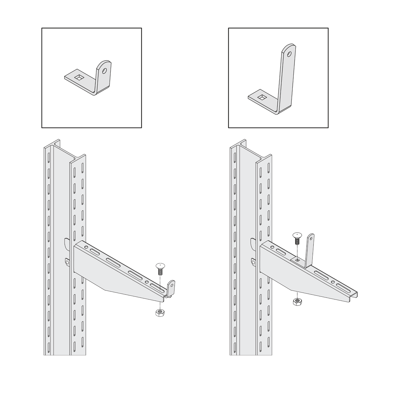 Beroende på lastkapacitet monteras grenställ med eller utan skruvar. Grenställ typ L och S utan hyllplan samt typ L med lutande hyllplan eller rörformade grenarmar kan monteras utan skruvar. Grenarmar och hyllnivåer kan justeras enligt önskat avstånd. Endast kraftiga grenställ av typ ES är bultade. Denna modell har en modulär design. Komponenter för inomhusbruk är epoxibelagda, komponenter för utomhusbruk är varmförzinkade.