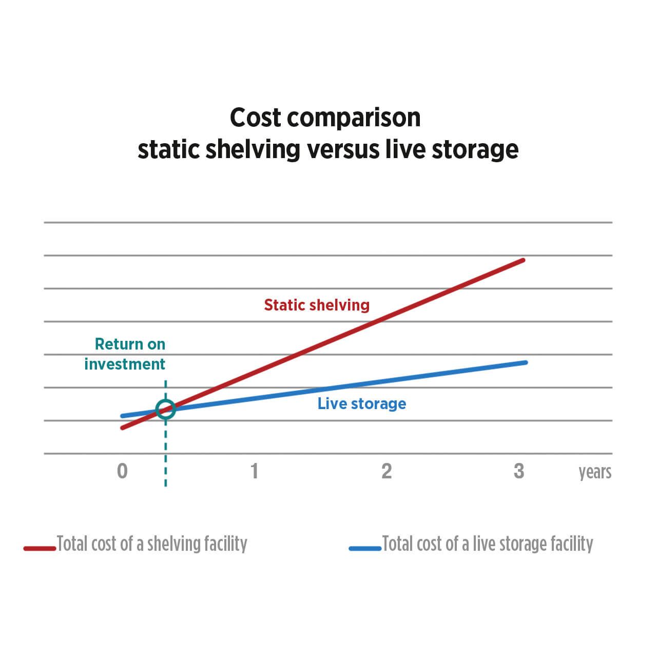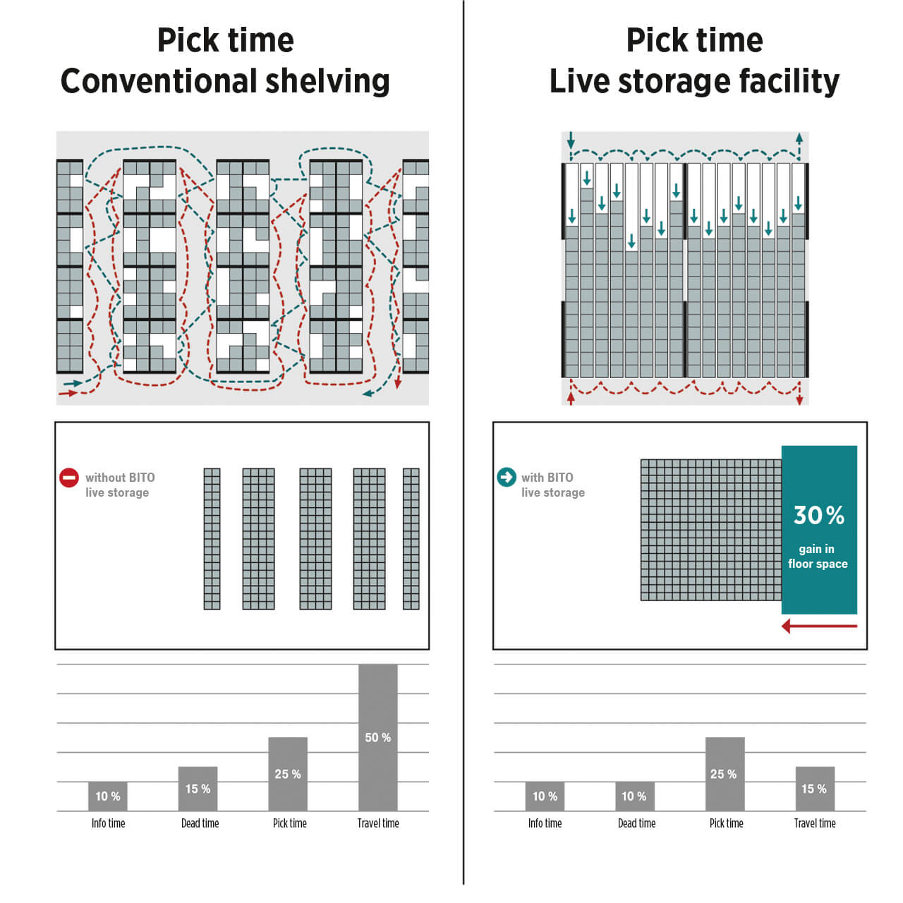 Genomloppsställ för stykegods tillhandahåller artiklar sorterade efter typ i angränsande kanaler. Det finns inga onödiga passager mellan kanalerna. Som ett resultat är utrymmesutnyttjandet mycket högre jämfört med konventionella statiska hyllställ. Kompakt förvaring ger en utrymmesbesparing på cirka 30 procent. Genomloppsställ för styckegods kan också kombineras med pallställ. Då utrustas pallstället med rullbanor på golvnivå som underlättar plockning. Medan varorna är tillgängliga för effektiv plockning på golvnivå, fungerar de övre nivåerna på pallstället som buffertlager för snabb påfyllning efter behov. Tack vare buffertlagret finns det alltid tillräckligt med produkter tillgängliga och redo för leverans. Dessutom utnyttjas lagerhöjden optimalt.