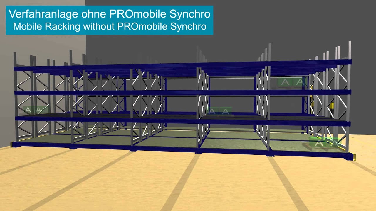 Пересувний палетний стелаж BITO PROmobile synchro відрізняється від BITO PROmobile регулюванням синхронності ходу. При цьому протягом всього процесу пересування палетних стелажів приділяється увага тому, щоб ряди стелажів рухалися абсолютно паралельно один одному, незалежно від різниці маси товарів на полицях стелажів або нерівномірності розподілу навантаження на стелажі. Візки переміщаються не традиційно механічним способом, а завдяки електроприводу, таким чином, транспортні візки завжди стоять або рухаються паралельно один одному. Ширину проходів можна проектувати з точністю до кількох міліметрів і оптимально розподіляти.